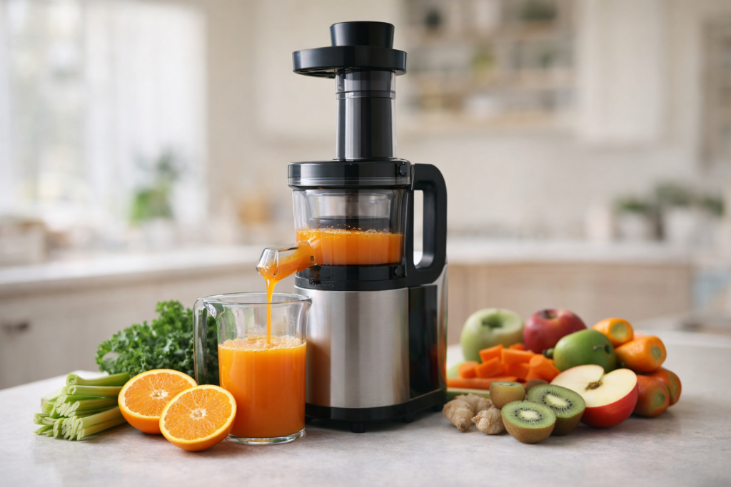 スロージューサーは、食材をゆっくり押しつぶすようにして、飲み物を作る家電です。