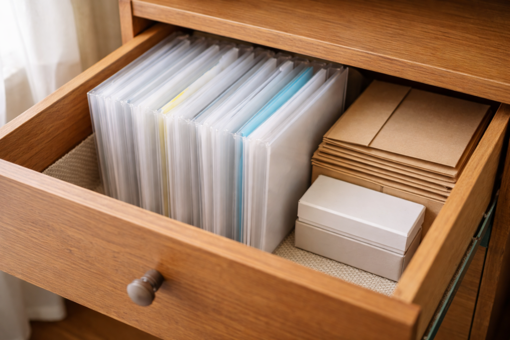 一番手軽なんは、クリアファイルとかポケットファイルを使う方法です。
