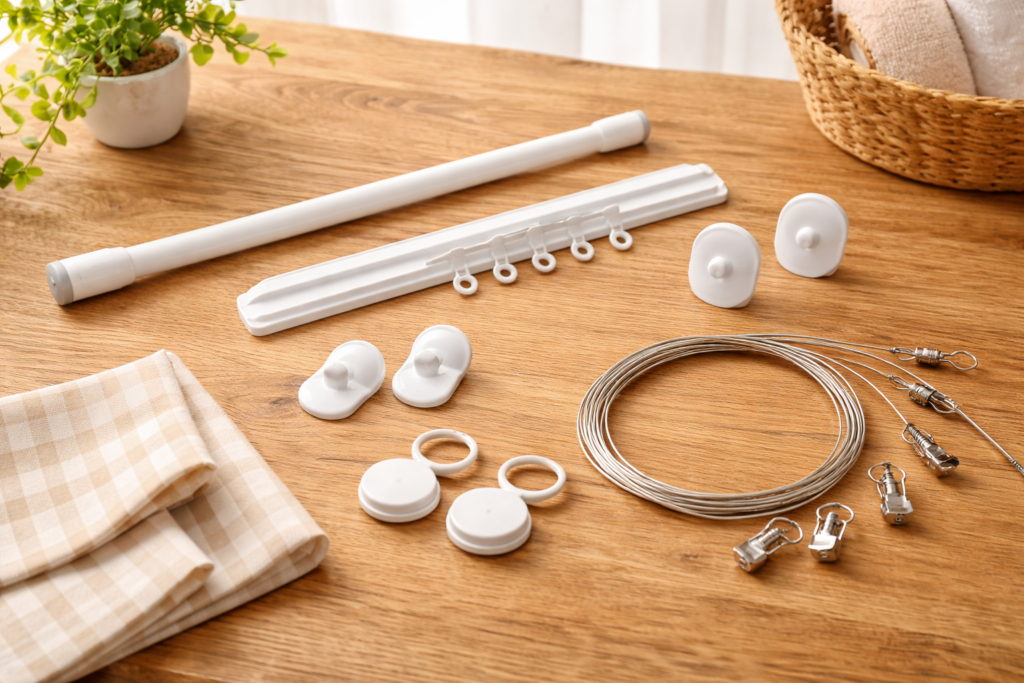 ワイヤーやレール、クリップなどを使えば、インテリアになじみやすく、カフェカーテンのデザインも引き立ちます。