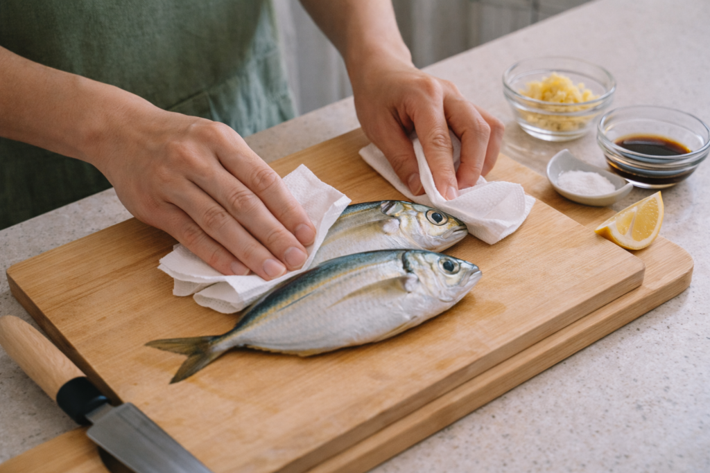 調理前には、魚の表面に残っとる水分をサッと拭いとくと、仕上がりが整いやすなります。