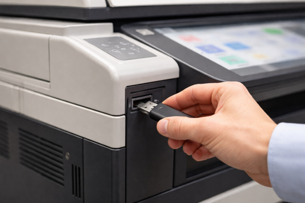 USBメモリーに保存したデータを直接マルチコピー機に接続して印刷する方法です。