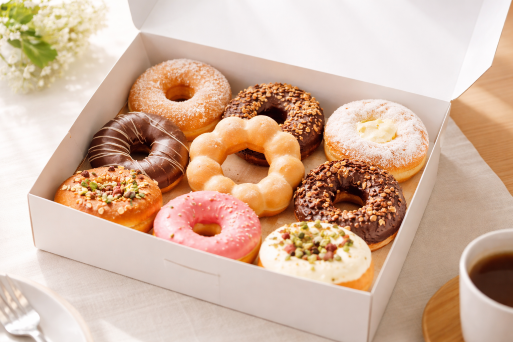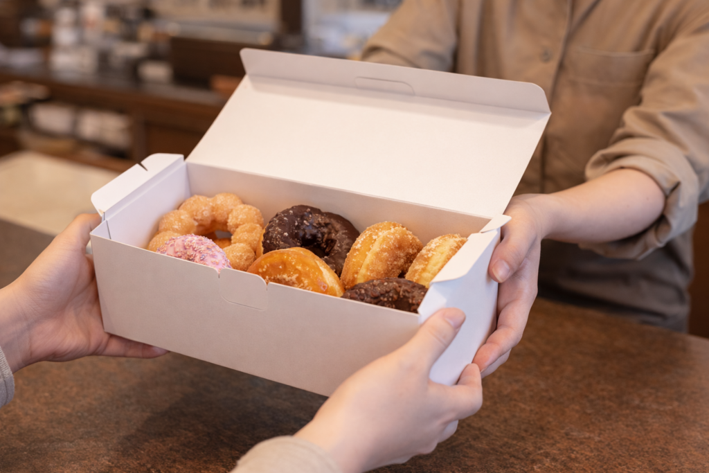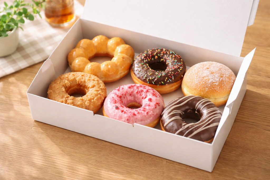 ドーナツを複数購入する場合、見た目や持ち運びやすさを考慮して箱に入れてもらえるケースが多いです。