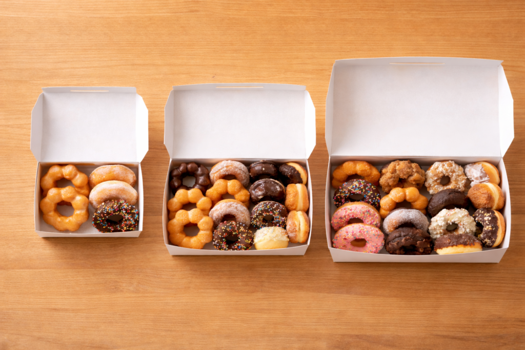 ミスドでは明確な「〇個専用箱」と表示されているわけではありませんが、個数ごとに選ばれやすいサイズの傾向があります。