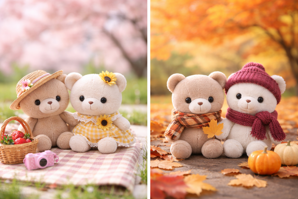 背景とぬいぐるみの色の相性も意識すると、写真の完成度がさらに高まります。