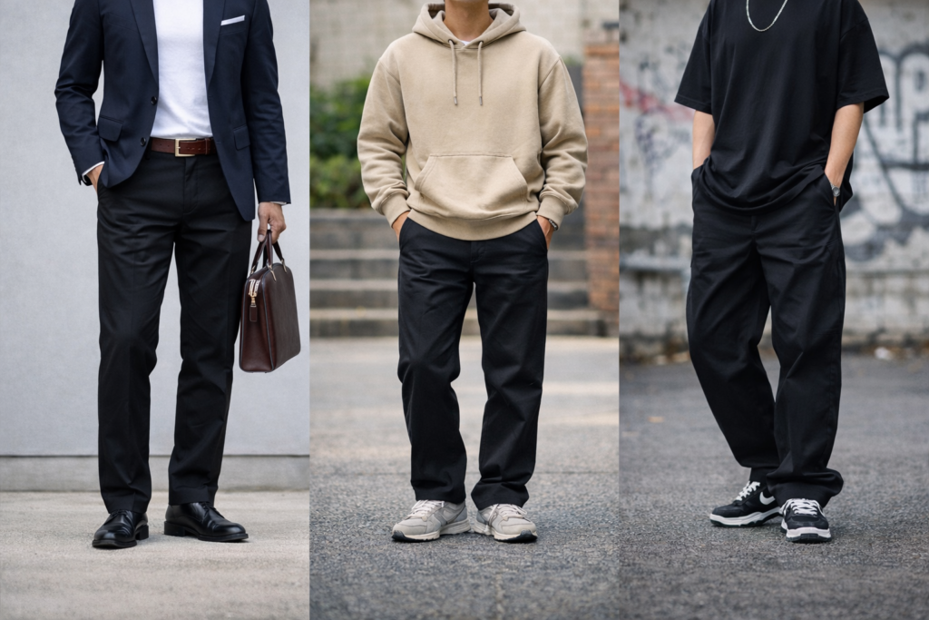 そのため、ジャケットや革靴と合わせるなら、ジャストサイズが映えやすい傾向があります。